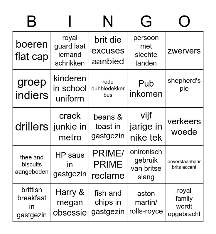 This bingo card has 25 words: HP saus in gastgezin, fish and chips in gastgezin, rode dubbledekker bus, brittish breakfast in gastgezin, zwervers, boeren flat cap, groep indiers, royal guard laat iemand schrikken, vijf jarige in nike tek, PRIME/ PRIME reclame, Pub inkomen, drillers, onironisch gebruik van britse slang, onverstaanbaar brits accent, kinderen in school uniform, royal family wordt opgebracht, verkeers woede, brit die excuses aanbied, shepherd's pie, crack junkie in metro, beans & toast in gastgezin, Harry & megan obsessie, thee and biscuits aangeboden, persoon met slechte tanden and aston martin/ rolls-royce.