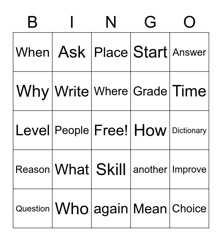 This bingo card has a free space and 24 words: What, Who, Where, Question, Answer, When, Why, Ask, How, Skill, Grade, Level, another, Improve, Write, Mean, Dictionary, Place, Time, People, Choice, Reason, Start and again.