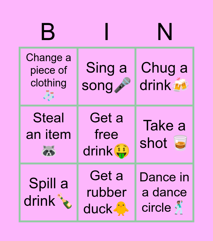 This bingo card has a free space and 8 words: Take a shot 🥃, Chug a drink🍻, Sing a song🎤, Spill a drink🍾, Change a piece of clothing🧦, Dance in a dance circle🕺🏽, Steal an item🦝 and Get a rubber duck🐥.