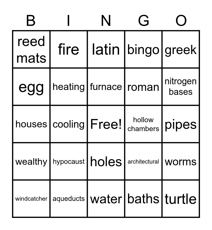 This bingo card has a free space and 24 words: hypocaust, aqueducts, furnace, windcatcher, greek, reed mats, egg, fire, hollow chambers, holes, roman, houses, architectural, worms, heating, baths, pipes, latin, nitrogen bases, cooling, turtle, wealthy, bingo and water.