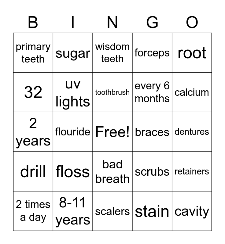 This bingo card has a free space and 24 words: floss, 8-11 years, toothbrush, 2 times a day, root, primary teeth, 32, sugar, braces, bad breath, every 6 months, 2 years, scrubs, retainers, uv lights, stain, dentures, wisdom teeth, calcium, flouride, cavity, drill, forceps and scalers.