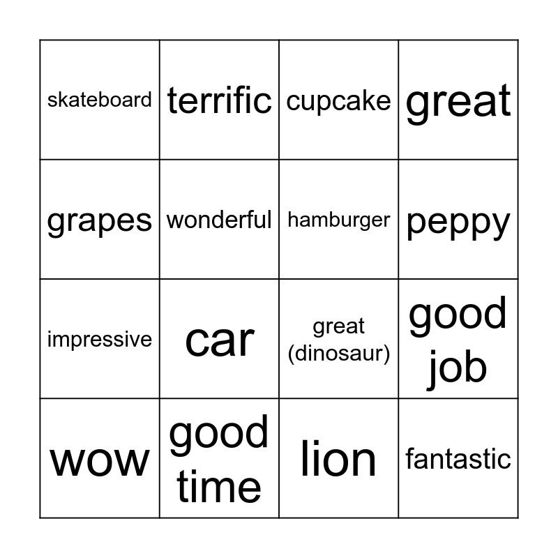 This bingo card has 24 words: pretty, yummy, peppy, banana, grapes, skateboard, wonderful, terrific, good time, beautiful, impressive, great (dinosaur), tiger, fries, hamburger, bear, lion, cupcake, car, good job, wow, fantastic, great and well done.