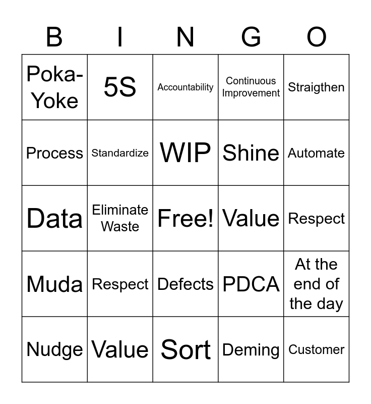This bingo card has a free space and 24 words: Respect, Value, WIP, Nudge, Straigthen, Poka-Yoke, Process, 5S, Value, Defects, Shine, Data, PDCA, At the end of the day, Standardize, Deming, Respect, Accountability, Automate, Eliminate Waste, Customer, Muda, Continuous Improvement and Sort.