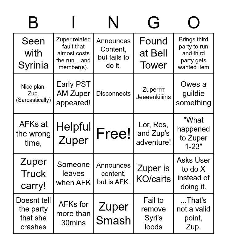 This bingo card has a free space and 24 words: Someone leaves when AFK, AFKs for more than 30mins, Disconnects, Doesnt tell the party that she crashes, Brings third party to run and third party gets wanted item, Seen with Syrinia, Nice plan, Zup. (Sarcastically), Zuper related fault that almost costs the run... and member(s)., Lor, Ros, and Zup's adventure!, Announces content, but is AFK., Zuperrrr Jeeeenkiiiins, AFKs at the wrong time,, Zuper is KO/carts, Asks User to do X instead of doing it., Early PST AM Zuper appeared!, Fail to remove Syri's loods, "What happened to Zuper 1-23", Announces Content, but fails to do it., Owes a guildie something, Helpful Zuper, ...That's not a valid point, Zup., Zuper Truck carry!, Found at Bell Tower and Zuper Smash.