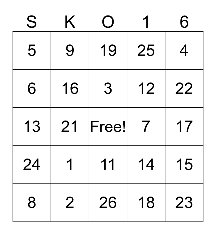 This bingo card has a free space and 24 words: 1, 2, 3, 8, 4, 5, 6, 9, 7, 11, 12, 13, 14, 15, 16, 18, 17, 19, 22, 21, 23, 24, 25 and 26.