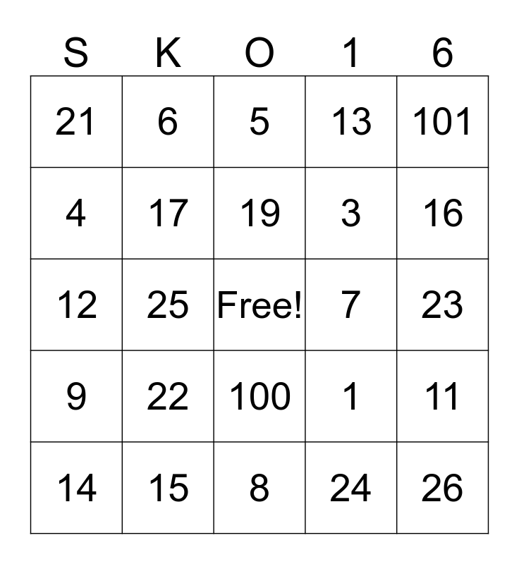 This bingo card has a free space and 27 words: 1, 2, 3, 8, 4, 5, 6, 9, 7, 11, 12, 13, 14, 15, 16, 18, 17, 19, 22, 21, 23, 24, 25, 26, 100, 101 and 102.