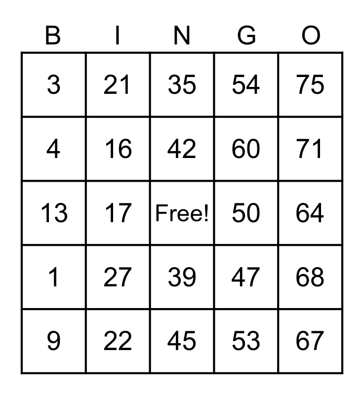 This bingo card has a free space and 24 words: 9, 27, 42, 53, 75, 3, 21, 35, 50, 64, 13, 16, 47, 68, 4, 22, 45, 54, 71, 1, 17, 39, 60 and 67.