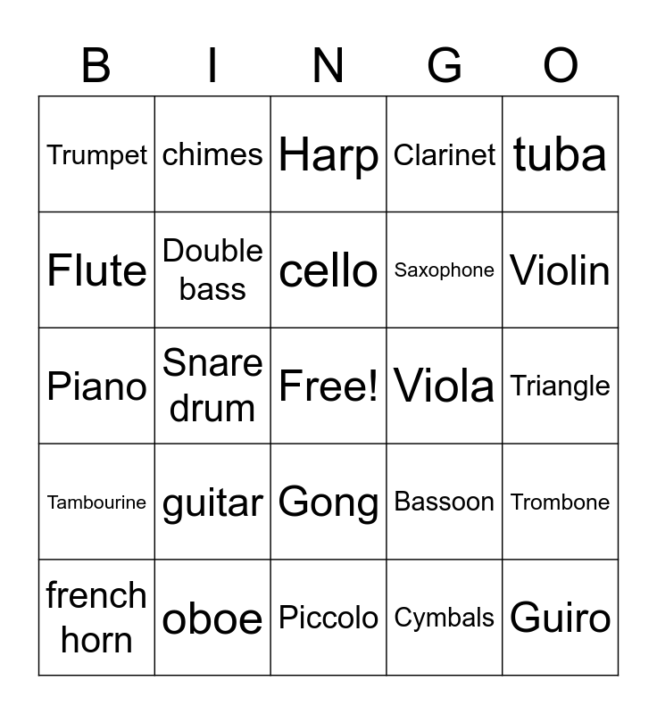This bingo card has a free space and 24 words: guitar, oboe, cello, french horn, tuba, Trumpet, Flute, chimes, Viola, Gong, Saxophone, Piano, Bassoon, Trombone, Double bass, Cymbals, Triangle, Harp, Violin, Snare drum, Guiro, Tambourine, Clarinet and Piccolo.