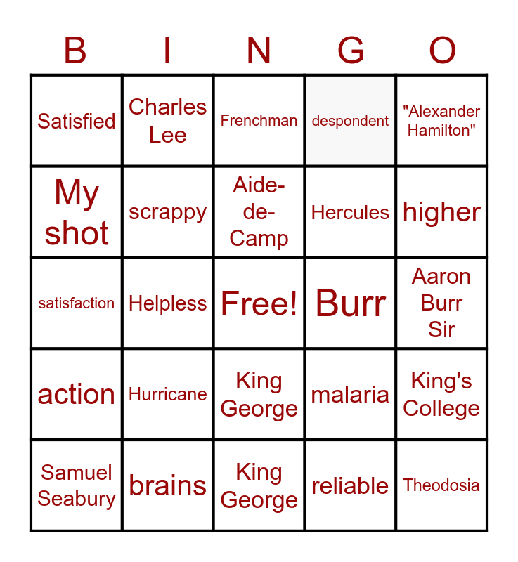 This bingo card has a free space and 24 words: Hurricane, brains, Aide-de-Camp, Samuel Seabury, "Alexander Hamilton", Satisfied, My shot, Charles Lee, Burr, King George, Hercules, satisfaction, malaria, King's College, scrappy, reliable, Aaron Burr Sir, Frenchman, higher, Helpless, Theodosia, action, despondent and King George.