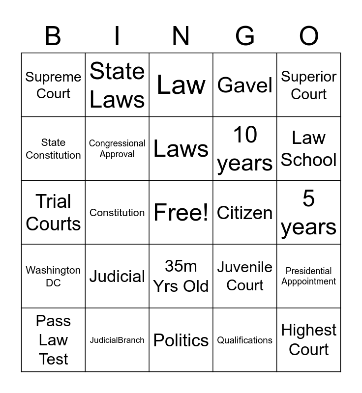 This bingo card has a free space and 24 words: Judicial, JudicialBranch, Laws, Pass Law Test, Superior Court, Supreme Court, State Constitution, State Laws, Citizen, 35m Yrs Old, 10 years, Trial Courts, Juvenile Court, Presidential Apppointment, Congressional Approval, Qualifications, 5 years, Law, Law School, Constitution, Highest Court, Washington DC, Gavel and Politics.