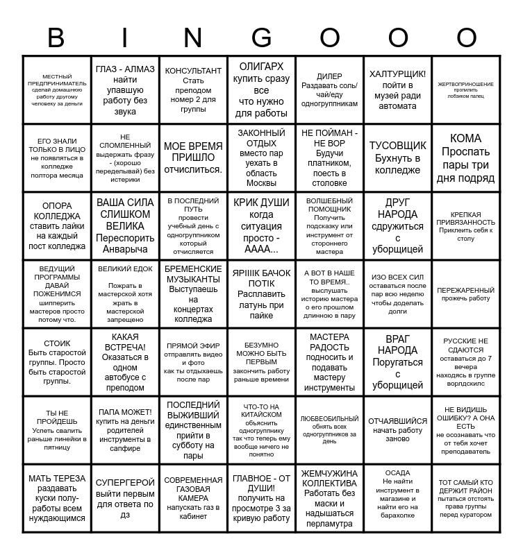 This bingo card has 55 words: ЖЕМЧУЖИНА КОЛЛЕКТИВА Работать без маски и надышаться перламутра, КРЕПКАЯ ПРИВЯЗАННОСТЬ Приклеить себя к столу, БЛИЦ-РАУНД Остаться после пар и доделать месячный объëм работы в один присест, МЕСТНЫЙ ПРЕДПРИНИМАТЕЛЬ сделай домашнюю работу другому человеку за деньги, ВЕЛИКИЙ ЕДОК Пожрать в мастерской хотя жрать в мастерской запрещено, ПАПА МОЖЕТ! купить на деньги родителей инструменты в сапфире, ЖЕРТВОПРИНОШЕНИЕ пропилить лобзиком палец, ШРАМ..БРАТ..ПОМОГИ МНЕ остаться дежурить вместо отсутствующего, НЕ СЛОМЛЕННЫЙ выдержать фразу - (хорошо переделывай) без истерики, ПОСЛЕДНИЙ ВЫЖИВШИЙ единственным прийти в субботу на пары, ОЛИГАРХ купить сразу все что нужно для работы, РУССКИЕ НЕ СДАЮТСЯ оставаться до 7 вечера находясь в группе ворлдскилс, ПЕРЕЖАРЕННЫЙ прожечь работу, ИЗО ВСЕХ СИЛ оставаться после пар всю неделю чтобы доделать долги, МАТЬ ТЕРЕЗА раздавать куски полу-работы всем нуждающимся, СТОИК Быть старостой группы. Просто быть старостой группы., ДИЛЕР Раздавать соль/чай/еду одногруппникам, НЕ ПОЙМАН - НЕ ВОР Будучи платником, поесть в столовке, ОСАДА Не найти инструмент в магазине и найти его на барахолке, ТУСОВЩИК Бухнуть в колледже, КОМА Проспать пары три дня подряд, КАКАЯ ВСТРЕЧА! Оказаться в одном автобусе с преподом, ВОЛШЕБНЫЙ ПОМОЩНИК Получить подсказку или инструмент от стороннего мастера, КОНСУЛЬТАНТ Стать преподом номер 2 для группы, ТОТ САМЫЙ КТО ДЕРЖИТ РАЙОН пытаться отстоять права группы перед куратором, ЕГО ЗНАЛИ ТОЛЬКО В ЛИЦО не появляться в колледже полтора месяца, БРЕМЕНСКИЕ МУЗЫКАНТЫ Выступаешь на концертах колледжа, ПОЧËТНЫЙ ДОНОР РОССИИ Залить кровью работу/порезаться много раз за один день, ОПОРА КОЛЛЕДЖА ставить лайки на каждый пост колледжа, ДРУГ НАРОДА сдружиться с уборщицей, САМ СЕБЕ ХОЗЯИН приходить когда захочешь, ВРАГ НАРОДА Поругаться с уборщицей, НЕ ВИДИШЬ ОШИБКУ? А ОНА ЕСТЬ не осознавать что от тебя хочет преподаватель, СУПЕРГЕРОЙ выйти первым для ответа по дз, ХАЛТУРЩИК! пойти в музей ради автомата, ЗАКОННЫЙ ОТДЫХ вместо пар уехать в область Москвы, ТЫ НЕ ПРОЙДЕШЬ Успеть свалить раньше линейки в пятницу, ВАША СИЛА СЛИШКОМ ВЕЛИКА Переспорить Анварыча, ЯРIIIIК БАЧОК ПОТIК Расплавить латунь при пайке, ПРЯМОЙ ЭФИР отправлять видео и фото как ты отдыхаешь после пар, ГЛАЗ - АЛМАЗ найти упавшую работу без звука, ЧТО-ТО НА КИТАЙСКОМ объяснить одногруппнику так что теперь ему вообще ничего не понятно, ЛЮБВЕОБИЛЬНЫЙ обнять всех одногруппников за день, ХОРОШИЙ ЛЮБОВНИК ходить от одного учителя к другому за советом, В ПОСЛЕДНИЙ ПУТЬ провести учебный день с одногруппником который отчисляется, ВЕДУЩИЙ ПРОГРАММЫ ДАВАЙ ПОЖЕНИМСЯ шипперить мастеров просто потому что., СОВРЕМЕННАЯ ГАЗОВАЯ КАМЕРА напускать газ в кабинет, МАСТЕРА РАДОСТЬ подносить и подавать мастеру инструменты, А ВОТ В НАШЕ ТО ВРЕМЯ.. выслушать историю мастера о его прошлом длинною в пару, МОЕ ВРЕМЯ ПРИШЛО отчислиться., БЕЗУМНО МОЖНО БЫТЬ ПЕРВЫМ закончить работу раньше времени, ОТЧАЯВШИЙСЯ начать работу заново, ГЛАВНОЕ - ОТ ДУШИ! получить на просмотре 3 за кривую работу, КРИК ДУШИ когда ситуация просто - АААА... and ШПИОН220 выведать информацию на следующий год от выпускников этого года.