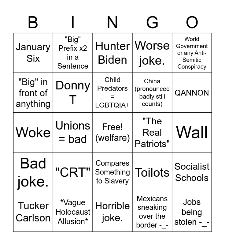 This bingo card has a free space and 24 words: "CRT", *Vague Holocaust Allusion*, Child Predators = LGBTQIA+, Tucker Carlson, World Government or any Anti-Semitic Conspiracy, January Six, "Big" in front of anything, "Big" Prefix x2 in a Sentence, "The Real Patriots", Compares Something to Slavery, China (pronounced badly still counts), Woke, Toilots, Socialist Schools, Donny T, Mexicans sneaking over the border -_-, Wall, Hunter Biden, QANNON, Unions = bad, Jobs being stolen -_-, Bad joke., Worse joke. and Horrible joke..