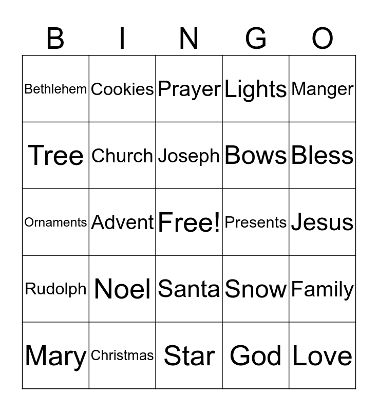 This bingo card has a free space and 24 words: Noel, Christmas, Joseph, Mary, Manger, Bethlehem, Tree, Cookies, Presents, Santa, Bows, Ornaments, Snow, Family, Church, God, Jesus, Prayer, Bless, Advent, Love, Rudolph, Lights and Star.