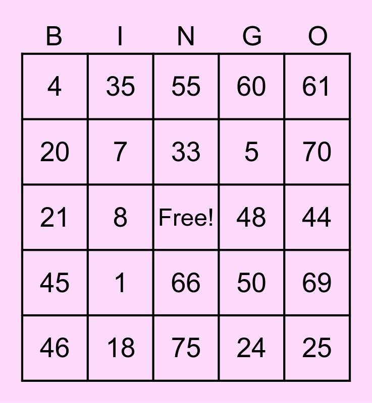 This bingo card has a free space and 24 words: 1, 18, 33, 46, 61, 4, 20, 35, 48, 66, 5, 21, 50, 69, 7, 24, 44, 55, 70, 8, 25, 45, 60 and 75.
