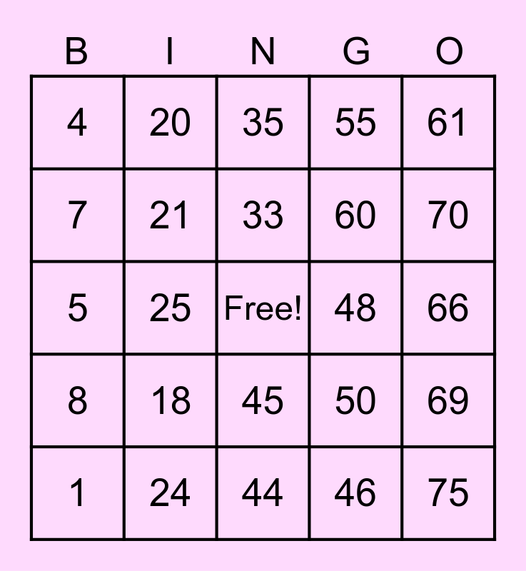 This bingo card has a free space and 24 words: 1, 18, 33, 46, 61, 4, 20, 35, 48, 66, 5, 21, 50, 69, 7, 24, 44, 55, 70, 8, 25, 45, 60 and 75.