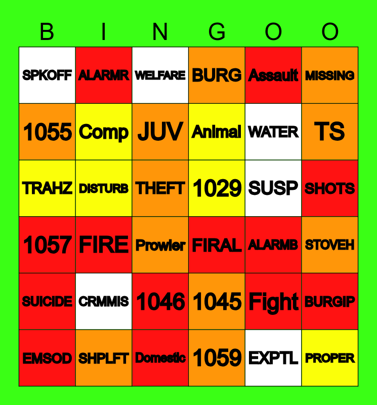 This bingo card has 36 words: 1045, 1046, 1059, 1055, 1057, 1029, Comp, Domestic, Assault, Fight, TS, BURG, BURGIP, DISTURB, Animal, SPKOFF, SUICIDE, SUSP, TRAHZ, WELFARE, THEFT, FIRE, FIRAL, Prowler, ALARMB, ALARMR, WATER, SHPLFT, JUV, MISSING, PROPER, EMSOD, STOVEH, SHOTS, CRMMIS and EXPTL.