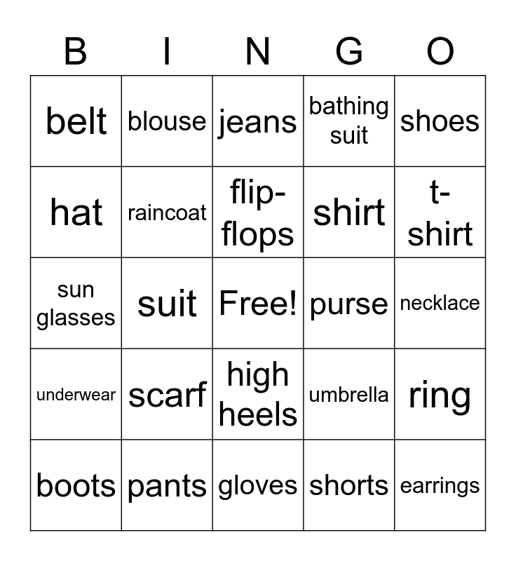 This bingo card has a free space and 39 words: clothing, coat, jacket, raincoat, boots, high heels, flip-flops, sandals, shoes, underwear, suit, bathing suit, earrings, necklace, purse, scarf, tie, belt, baseball hat, umbrella, hat, gloves, shirt, t-shirt, sweatshirt, sweater, vest, slippers, socks, blouse, skirt, dress, jeans, pants, shorts, pajamas, ring, sun glasses and to wear.