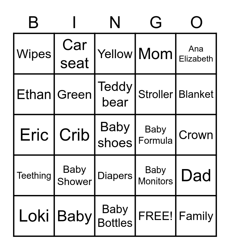 This bingo card has 30 words: Baby, Boy, Crib, Pacifier, Wipes, Yellow, Green, Diapers, Baby Formula, Baby Bottles, Crown, Baby shoes, FREE!, Family, Blanket, High Chair, Baby Monitors, Teething, Baby Shower, Ana Elizabeth, Eric, Baby Food, Car seat, Stroller, Ethan, Mom, Dad, Loki, Teddy bear and Gold.