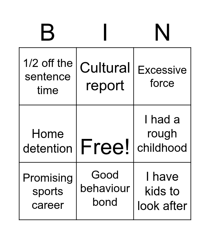 This bingo card has a free space and 8 words: I had a rough childhood, Excessive force, Cultural report, Promising sports career, 1/2 off the sentence time, I have kids to look after, Home detention and Good behaviour bond.