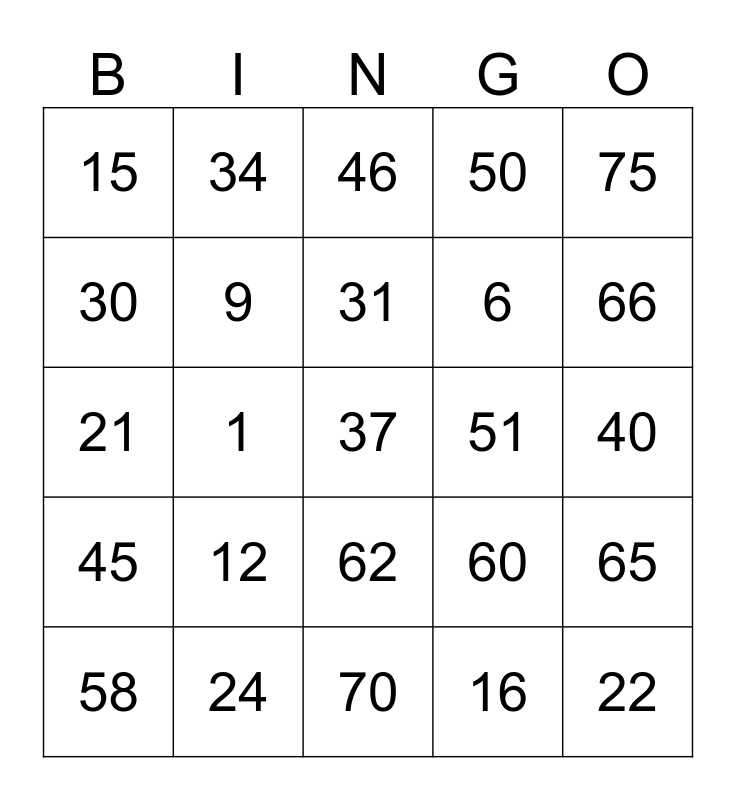 This bingo card has a free space and 24 words: 12, 24, 31, 58, 75, 15, 30, 34, 51, 62, 6, 21, 60, 65, 9, 16, 40, 46, 66, 1, 22, 45, 50 and 70.