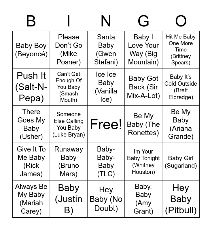 This bingo card has a free space and 24 words: Runaway Baby (Bruno Mars), Baby (Justin B), Ice Ice Baby (Vanilla Ice), Always Be My Baby (Mariah Carey), Hit Me Baby One More Time (Brittney Spears), Baby Boy (Beyoncé), Push It (Salt-N-Pepa), Please Don’t Go (Mike Posner), Be My Baby (The Ronettes), Baby-Baby-Baby (TLC), Baby Got Back (Sir Mix-A-Lot), There Goes My Baby (Usher), Im Your Baby Tonight (Whitney Houston), Baby Girl (Sugarland), Can’t Get Enough Of You Baby (Smash Mouth), Baby, Baby (Amy Grant), Be My Baby (Ariana Grande), Santa Baby (Gwen Stefani), Baby It’s Cold Outside (Brett Eldredge), Someone Else Calling You Baby (Luke Bryan), Hey Baby (Pitbull), Give It To Me Baby (Rick James), Baby I Love Your Way (Big Mountain) and Hey Baby (No Doubt).
