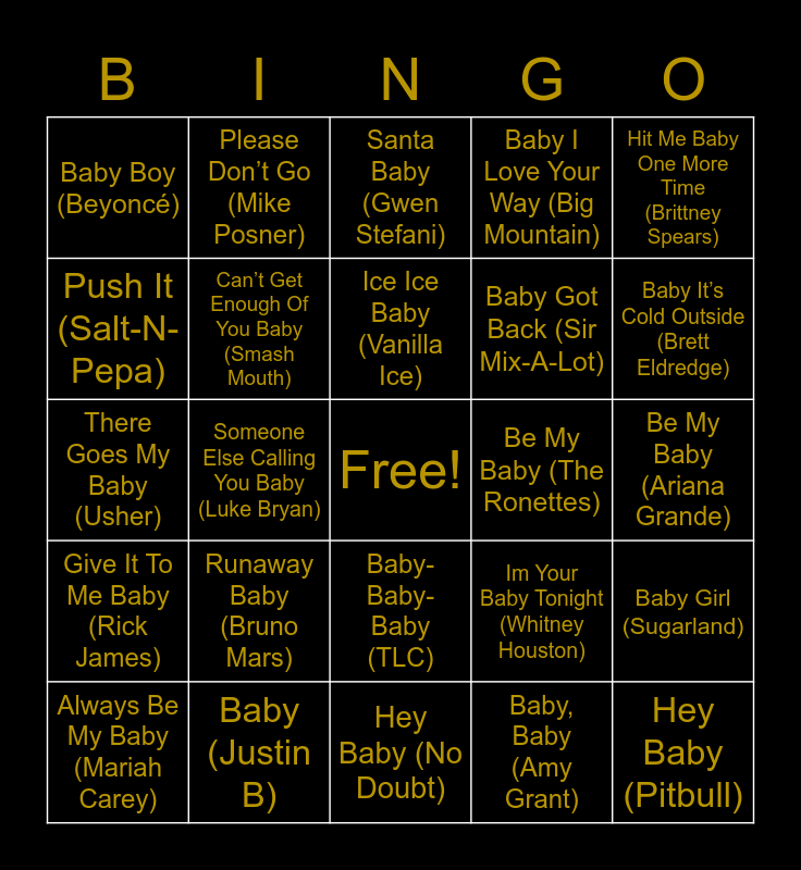 This bingo card has a free space and 24 words: Runaway Baby (Bruno Mars), Baby (Justin B), Ice Ice Baby (Vanilla Ice), Always Be My Baby (Mariah Carey), Hit Me Baby One More Time (Brittney Spears), Baby Boy (Beyoncé), Push It (Salt-N-Pepa), Please Don’t Go (Mike Posner), Be My Baby (The Ronettes), Baby-Baby-Baby (TLC), Baby Got Back (Sir Mix-A-Lot), There Goes My Baby (Usher), Im Your Baby Tonight (Whitney Houston), Baby Girl (Sugarland), Can’t Get Enough Of You Baby (Smash Mouth), Baby, Baby (Amy Grant), Be My Baby (Ariana Grande), Santa Baby (Gwen Stefani), Baby It’s Cold Outside (Brett Eldredge), Someone Else Calling You Baby (Luke Bryan), Hey Baby (Pitbull), Give It To Me Baby (Rick James), Baby I Love Your Way (Big Mountain) and Hey Baby (No Doubt).