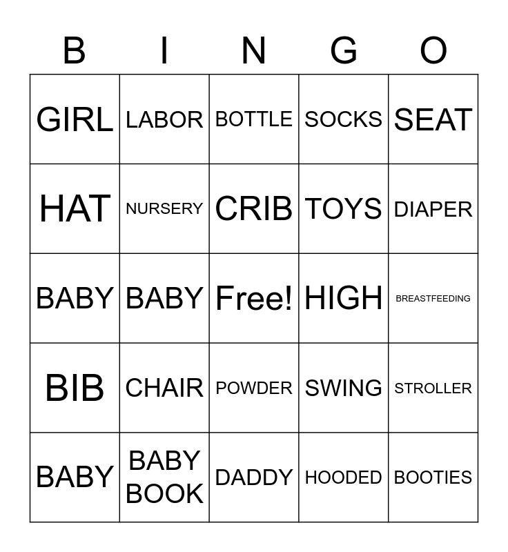 This bingo card has a free space and 39 words: MILK, BABY, LOTION, NURSERY, BABY, POWDER, CRIB, CAR, SEAT, BIB, BABY, SOCKS, BOOTIES, BREASTFEEDING, HIGH, CHAIR, BABY, GIRL, BABY, SWING, HAT, DADDY, TOYS, DIAPER, CRYING, BATH, MOMMY, RATTLE, ONESIE, LABOR, BASSINET, LULLABY, BOTTLE, BABY BOOK, HOODED, TOWEL, STROLLER, BABY and MONITOR.