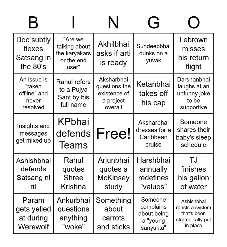 This bingo card has a free space and 24 words: Rahul quotes Shree Krishna, Ankurbhai questions anything "woke", Aksharbhai questions the existence of a project overall, Param gets yelled at during Werewolf, Lebrown misses his return flight, Doc subtly flexes Satsang in the 80's, An issue is "taken offline" and never resolved, "Are we talking about the karyakars or the end user", Aksharbhai dresses for a Caribbean cruise, Arjunbhai quotes a McKinsey study, Ketanbhai takes off his cap, Insights and messages get mixed up, Harshbhai annually redefines "values", TJ finishes his gallon of water, Rahul refers to a Pujya Sant by his full name, Someone complains about being a "young sanyukta", Someone shares their baby's sleep schedule, Akhilbhai asks if arti is ready, Darshanbhai laughs at an unfunny joke to be supportive, KPbhai defends Teams, Ashishbhai roasts a system that's been strategically put in place, Ashishbhai defends Satsang ni rit, Sundeepbhai dunks on a yuvak and Something about carrots and sticks.