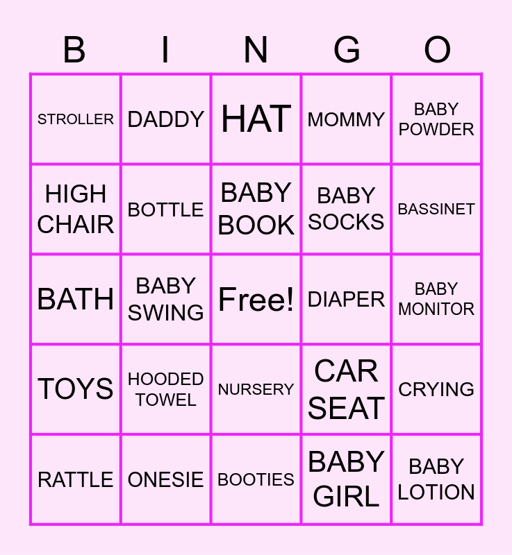 This bingo card has a free space and 27 words: CAR SEAT, BIB, BABY SOCKS, BOOTIES, HIGH CHAIR, HAT, DADDY, TOYS, DIAPER, CRYING, BATH, MOMMY, RATTLE, ONESIE, BASSINET, LULLABY, BOTTLE, BABY BOOK, HOODED TOWEL, STROLLER, BABY MONITOR, BABY GIRL, BABY SWING, BABY LOTION, NURSERY, BABY POWDER and CRIB.