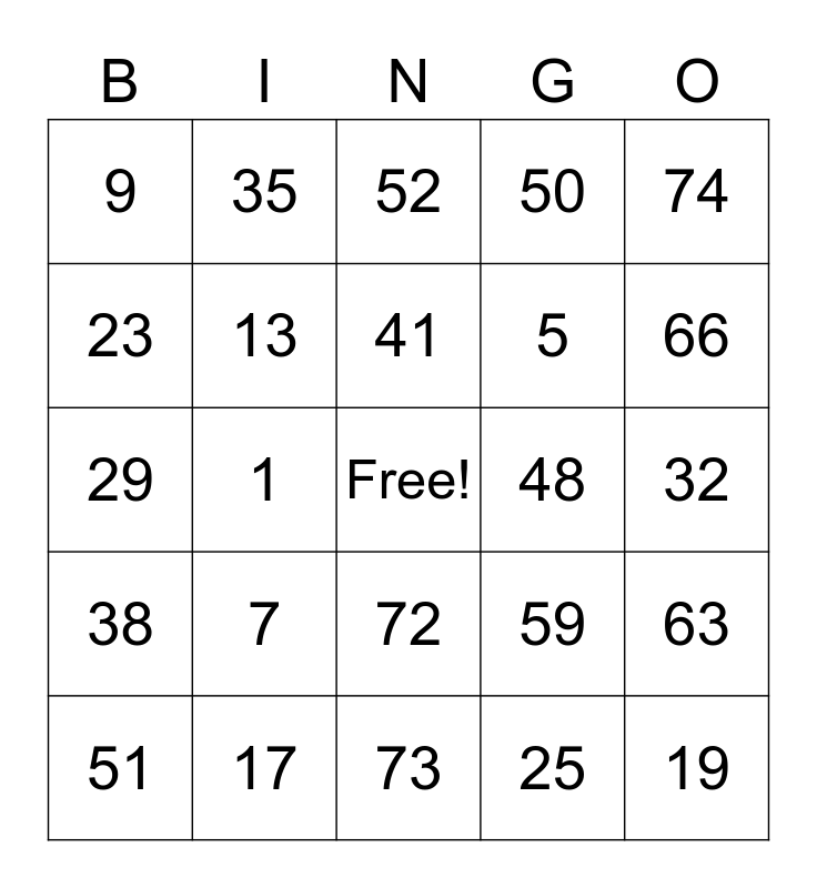 This bingo card has a free space and 24 words: 7, 17, 41, 51, 74, 9, 23, 35, 48, 72, 5, 29, 59, 63, 13, 25, 32, 52, 66, 1, 19, 38, 50 and 73.