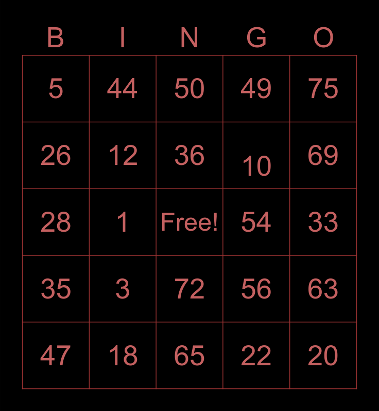 This bingo card has a free space and 24 words: 3, 18, 36, 47, 75, 5, 26, 44, 54, 72, 10, 28, 56, 63, 12, 22, 33, 50, 69, 1, 20, 35, 49 and 65.