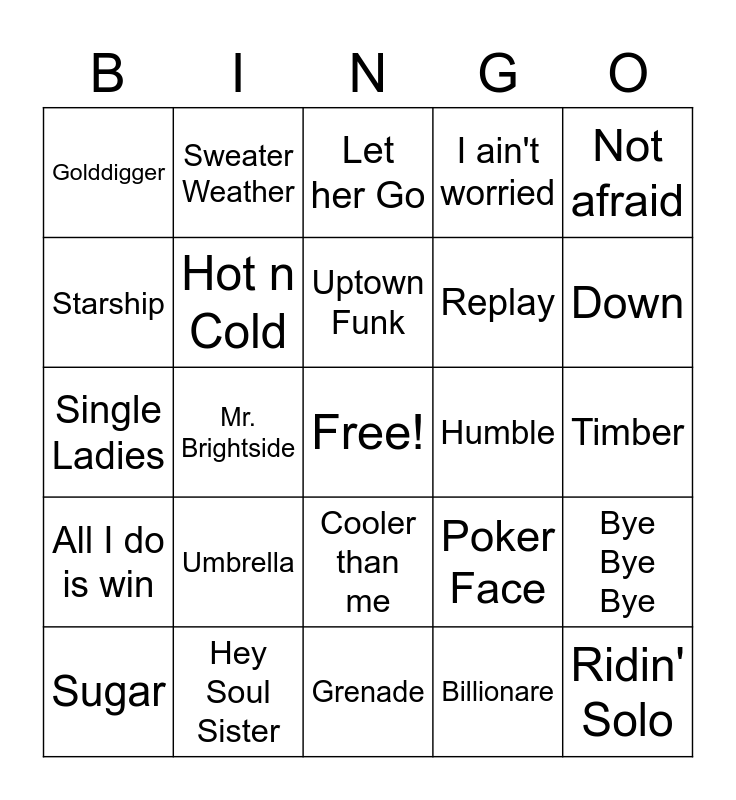 This bingo card has a free space and 29 words: Sugar, Hey Ya, Mr. Brightside, Fireflies, Golddigger, Let her Go, Hot n Cold, Umbrella, Humble, Hey Soul Sister, Timber, Ridin' Solo, Grenade, Billionare, Down, Baby, Cooler than me, All I do is win, Not afraid, Single Ladies, Poker Face, Hey there Delilah, Replay, Starship, I ain't worried, Sweater Weather, Bye Bye Bye, Uptown Funk and Girlfriend.