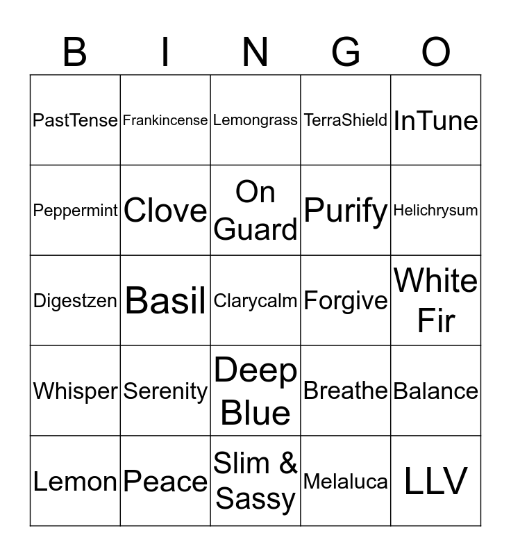 This bingo card has a free space and 24 words: Serenity, Peace, On Guard, Lemon, InTune, PastTense, Peppermint, Frankincense, Forgive, Deep Blue, Purify, Digestzen, Breathe, Balance, Clove, Melaluca, White Fir, Lemongrass, Helichrysum, Basil, LLV, Whisper, TerraShield and Slim & Sassy.