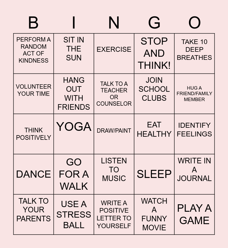 This bingo card has a free space and 24 words: GO FOR A WALK, USE A STRESS BALL, TALK TO A TEACHER OR COUNSELOR, TALK TO YOUR PARENTS, TAKE 10 DEEP BREATHES, PERFORM A RANDOM ACT OF KINDNESS, VOLUNTEER YOUR TIME, SIT IN THE SUN, EAT HEALTHY, LISTEN TO MUSIC, JOIN SCHOOL CLUBS, THINK POSITIVELY, SLEEP, WRITE IN A JOURNAL, HANG OUT WITH FRIENDS, WATCH A FUNNY MOVIE, IDENTIFY FEELINGS, EXERCISE, HUG A FRIEND/FAMILY MEMBER, YOGA, PLAY A GAME, DANCE, STOP AND THINK! and WRITE A POSITIVE LETTER TO YOURSELF.