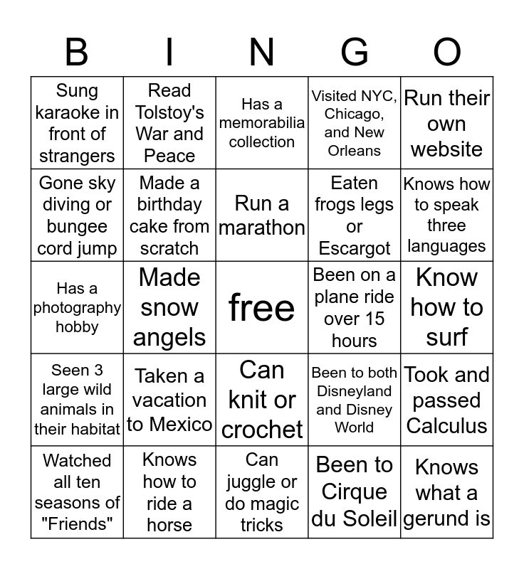 This bingo card has a free space and 24 words: Taken a vacation to Mexico, Knows how to ride a horse, Run a marathon, Watched all ten seasons of "Friends", Run their own website, Sung karaoke in front of strangers, Gone sky diving or bungee cord jump, Read Tolstoy's War and Peace, Been on a plane ride over 15 hours, Can knit or crochet, Eaten frogs legs or Escargot, Has a photography hobby, Been to both Disneyland and Disney World, Took and passed Calculus, Made a birthday cake from scratch, Been to Cirque du Soleil, Know how to surf, Has a memorabilia collection, Knows how to speak three languages, Made snow angels, Knows what a gerund is, Seen 3 large wild animals in their habitat, Visited NYC, Chicago, and New Orleans and Can juggle or do magic tricks.