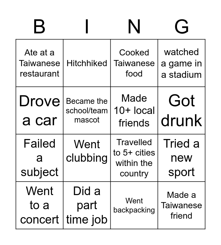 This bingo card has 16 words: Did a part time job, Tried a new sport, Cooked Taiwanese food, Ate at a Taiwanese restaurant, Failed a subject, Hitchhiked, Travelled to 5+ cities within the country, Went backpacking, Drove a car, Became the school/team mascot, Went to a concert, watched a game in a stadium, Went clubbing, Got drunk, Made 10+ local friends and Made a Taiwanese friend.
