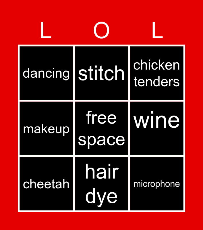 This bingo card has a free space and 8 words: wine, chicken tenders, stitch, cheetah, dancing, microphone, makeup and hair dye.