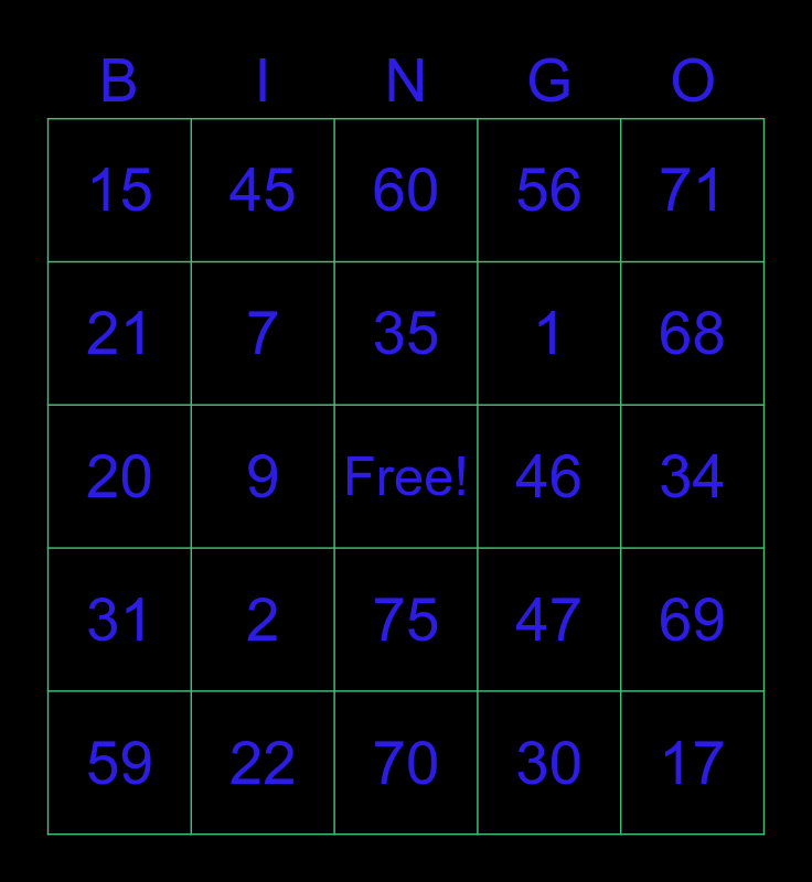 This bingo card has a free space and 24 words: 2, 22, 35, 59, 71, 15, 21, 45, 46, 75, 1, 20, 47, 69, 7, 30, 34, 60, 68, 9, 17, 31, 56 and 70.
