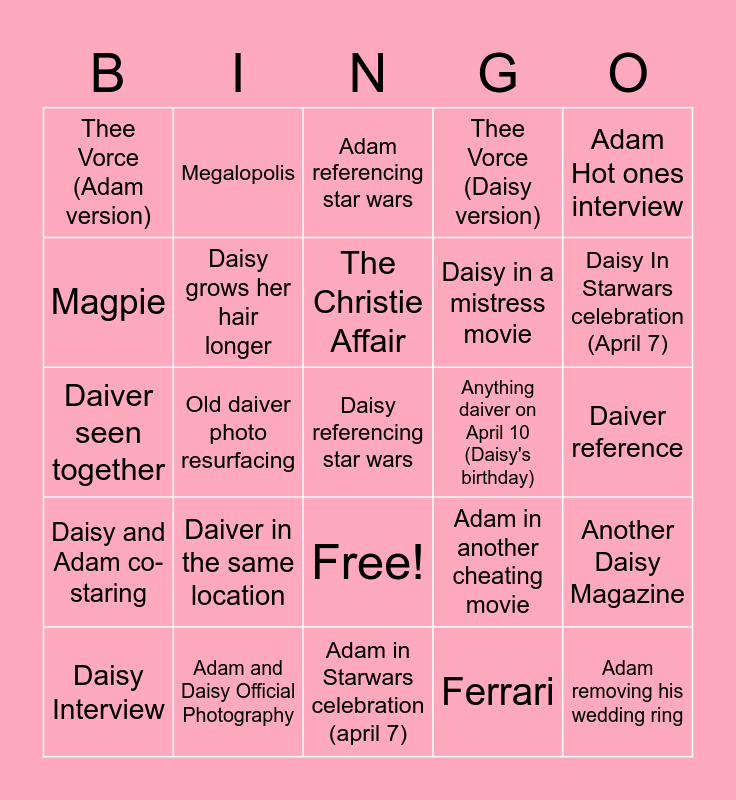 This bingo card has 26 words: Free!, Ferrari, The Christie Affair, Adam and Daisy Official Photography, Adam Hot ones interview, Thee Vorce (Adam version), Magpie, Megalopolis, Daiver reference, Adam in another cheating movie, Daisy in a mistress movie, Daiver seen together, Another Daisy Magazine, Daisy Interview, Old daiver photo resurfacing, Adam taking a two-week break, Thee Vorce (Daisy version), Daisy and Adam co-staring, Adam referencing star wars, Daisy referencing star wars, Daisy In Starwars celebration (April 7), Adam in Starwars celebration (april 7), Anything daiver on April 10 (Daisy's birthday), Daiver in the same location, Daisy grows her hair longer and Adam removing his wedding ring.