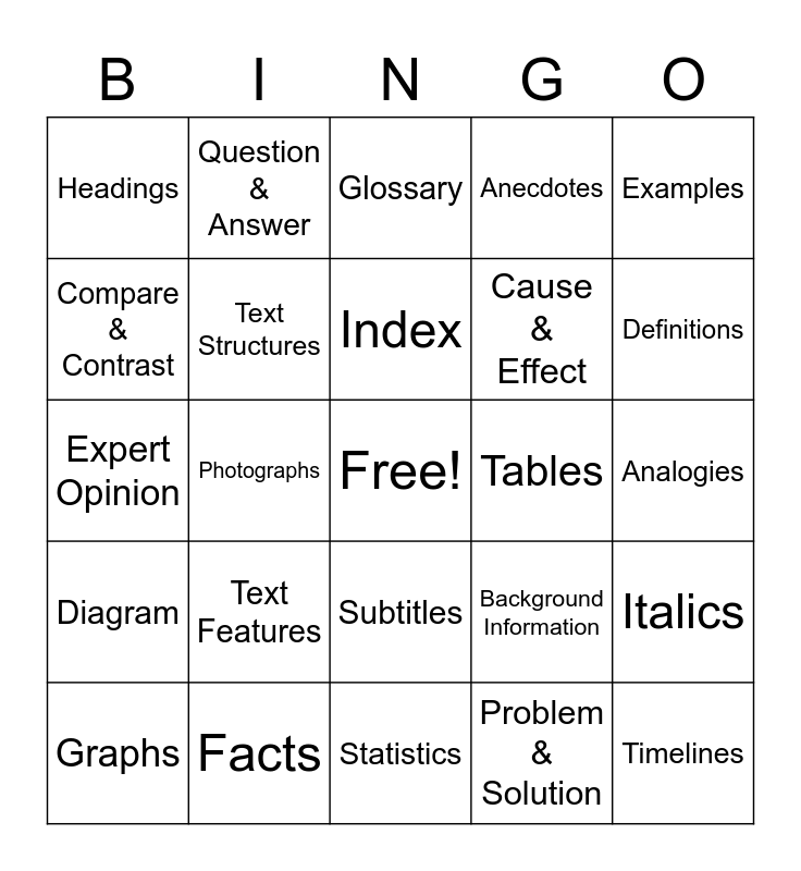 This bingo card has a free space and 28 words: Italics, Chronological, Cause & Effect, Problem & Solution, Compare & Contrast, Glossary, Question & Answer, Diagram, Tables, Graphs, Expert Opinion, Anecdotes, Facts, Statistics, Definitions, Bullet Points, Text Features, Text Structures, Index, Subtitles, Headings, Charts, Timelines, Photographs, Analogies, Background Information, Examples and Analysis.