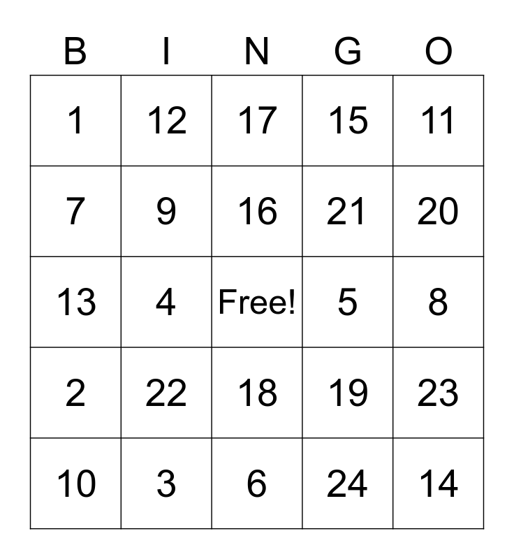 This bingo card has a free space and 24 words: 22, 3, 16, 10, 11, 1, 7, 12, 5, 18, 21, 13, 19, 23, 9, 24, 8, 17, 20, 4, 14, 2, 15 and 6.