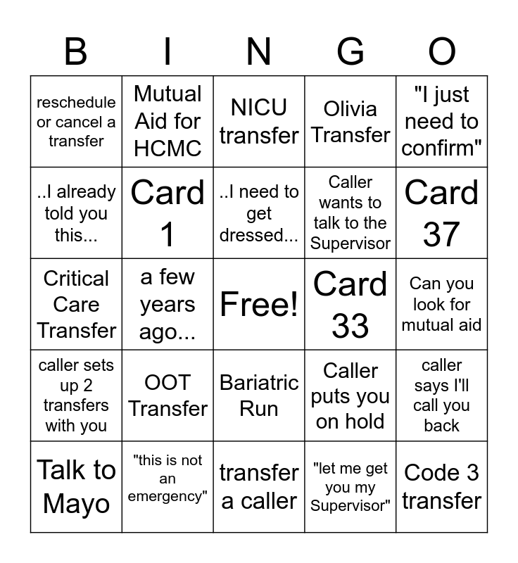 This bingo card has a free space and 44 words: Put stand by in notes, Code 3 transfer, Talk to Health partners, Talk to Mayo, BLS level 3, "let me get you my Supervisor", NICU transfer, Out of area Pre arrival, "I just need to confirm", "this is not an emergency", Olivia Transfer, Card 33, Bariatric Run, OOT Transfer, Mercy to Unity, transfer a caller, Mental Health Transfer, Critical Care Transfer, ALS Transfer, Card 37, Mutual Aid for HCMC, Mutual Aid for North, update call notes, reschedule or cancel a transfer, ETA given, Can you look for mutual aid, update an address, River Falls Transfer, Caller puts you on hold, caller sets up 2 transfers with you, Flight Transfer, caller says I'll call you back, Card 22, just get them here.., a few years ago..., pre-arrival lasting over 7 minutes, caller can't get to the door, ..its just me and my pet..., ..I need to get dressed..., ..I already told you this..., Caller wants to talk to the Supervisor, "Do you know where they are coming from", Card 1 and Card 3.