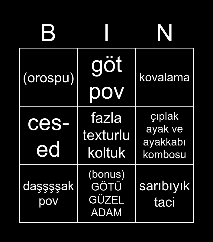 This bingo card has a free space and 8 words: çıplak ayak ve ayakkabı kombosu, kovalama, göt pov, daşşşşak pov, (orospu), sarıbıyık taci, ces-ed and (bonus) GÖTÜ GÜZEL ADAM.