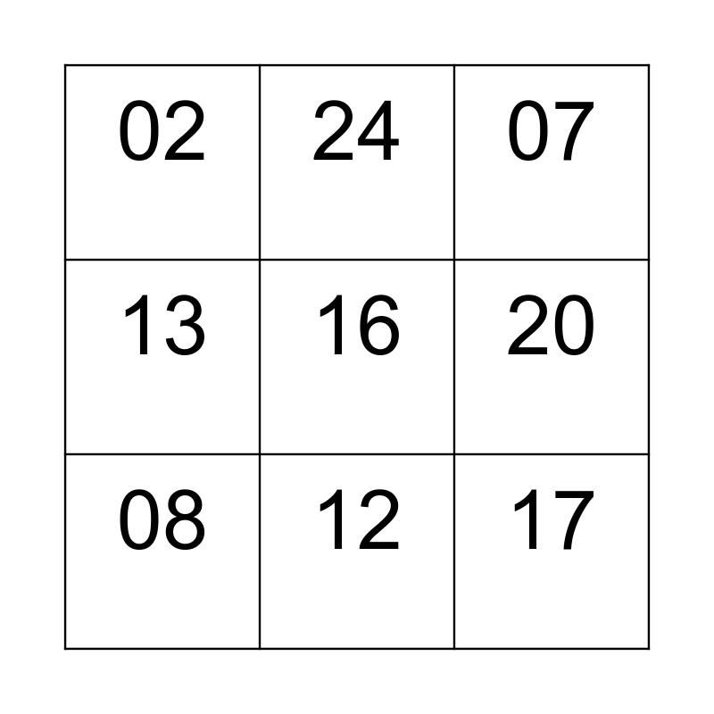 This bingo card has a free space and 11 words: 05, 12, 17, 08, 24, 07, 20, 26, 13, 02 and 27.