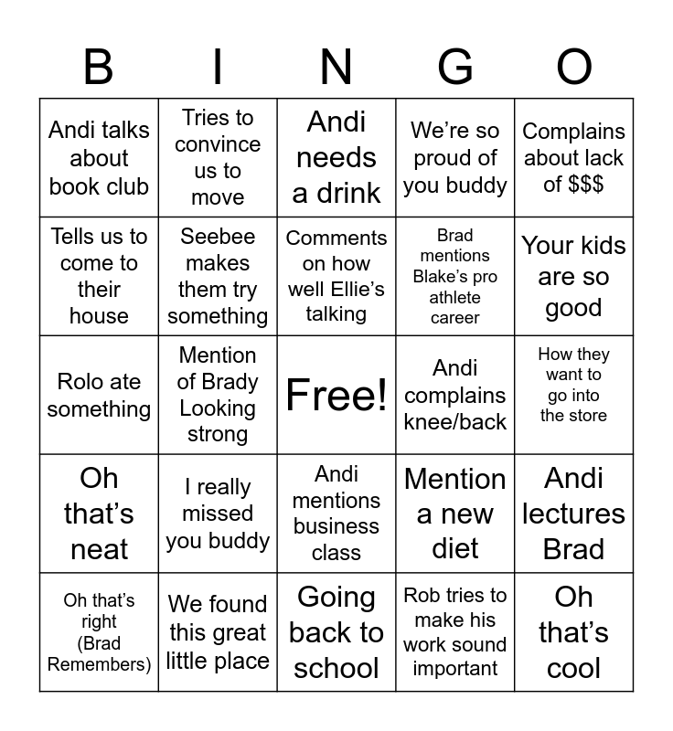 This bingo card has a free space and 24 words: I really missed you buddy, We found this great little place, Comments on how well Ellie’s talking, Oh that’s right (Brad Remembers), Complains about lack of $$$, Andi talks about book club, Tells us to come to their house, Tries to convince us to move, Andi complains knee/back, Andi mentions business class, Brad mentions Blake’s pro athlete career, Rolo ate something, Mention a new diet, Andi lectures Brad, Seebee makes them try something, Rob tries to make his work sound important, How they want to go into the store, Andi needs a drink, Your kids are so good, Mention of Brady Looking strong, Oh that’s cool, Oh that’s neat, We’re so proud of you buddy and Going back to school.
