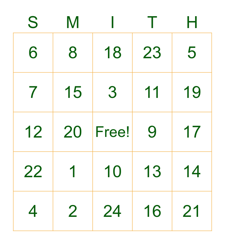 This bingo card has a free space and 24 words: 1, 2, 3, 4, 5, 6, 7, 8, 9, 10, 11, 12, 13, 14, 15, 16, 17, 18, 19, 20, 21, 22, 23 and 24.