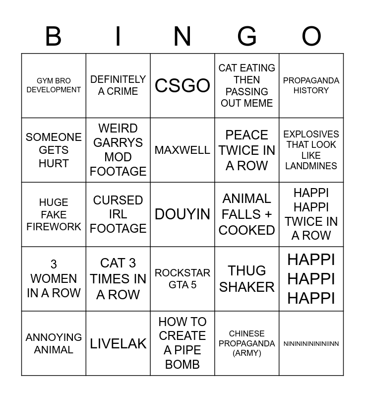 This bingo card has a free space and 24 words: CAT 3 TIMES IN A ROW, LIVELAK, MAXWELL, ANNOYING ANIMAL, PROPAGANDA HISTORY, GYM BRO DEVELOPMENT, SOMEONE GETS HURT, DEFINITELY A CRIME, ANIMAL FALLS + COOKED, ROCKSTAR GTA 5, PEACE TWICE IN A ROW, HUGE FAKE FIREWORK, THUG SHAKER, HAPPI HAPPI HAPPI, WEIRD GARRYS MOD FOOTAGE, CHINESE PROPAGANDA (ARMY), HAPPI HAPPI TWICE IN A ROW, CSGO, EXPLOSIVES THAT LOOK LIKE LANDMINES, CURSED IRL FOOTAGE, NININININININIINN, 3 WOMEN IN A ROW, CAT EATING THEN PASSING OUT MEME and HOW TO CREATE A PIPE BOMB.