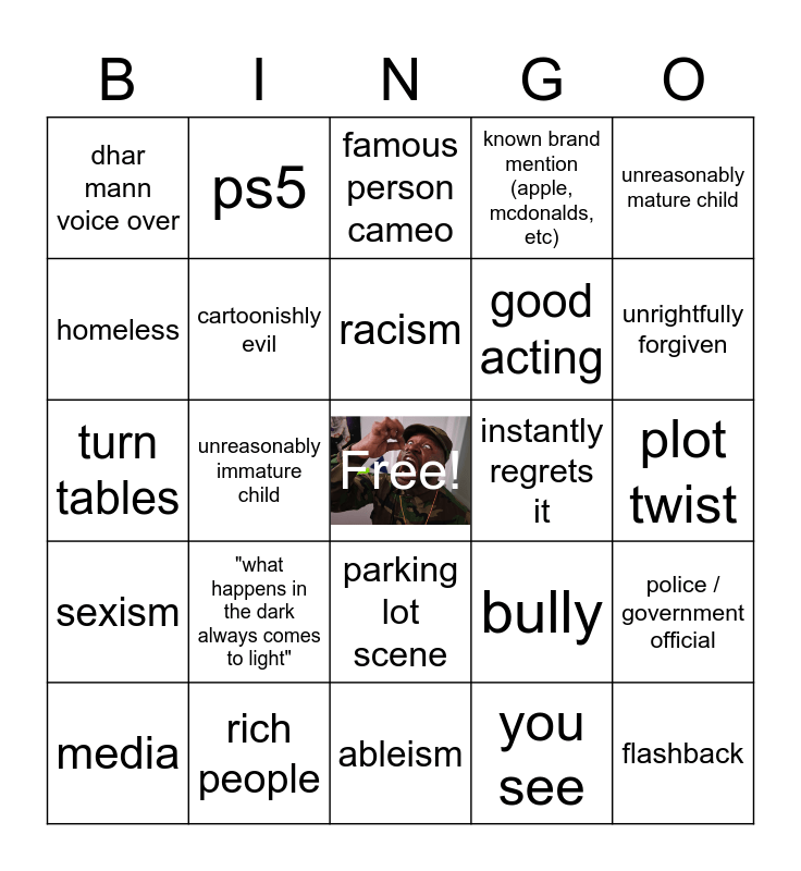 This bingo card has a free space and 24 words: "what happens in the dark always comes to light", rich people, racism, media, unreasonably mature child, dhar mann voice over, homeless, ps5, instantly regrets it, parking lot scene, good acting, turn tables, bully, police / government official, cartoonishly evil, you see, plot twist, famous person cameo, unrightfully forgiven, unreasonably immature child, flashback, sexism, known brand mention (apple, mcdonalds, etc) and ableism.