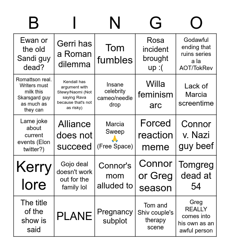 This bingo card has a free space and 24 words: Gojo deal doesn't work out for the family lol, PLANE, Insane celebrity cameo/needle drop, The title of the show is said, Godawful ending that ruins series a la AOT/TokRev, Ewan or the old Sandi guy dead?, Romattson real. Writers must milk this Skarsgard guy as much as they can, Gerri has a Roman dilemma, Forced reaction meme, Connor's mom alluded to, Willa feminism arc, Lame joke about current events (Elon twitter?), Connor or Greg season, Tomgreg dead at 54, Kendall has argument with Stewy/Naomi (Not saying Rava because that's not as risky), Tom and Shiv couple's therapy scene, Connor v. Nazi guy beef, Tom fumbles, Lack of Marcia screentime, Alliance does not succeed, Greg REALLY comes into his own as an awful person, Kerry lore, Rosa incident brought up :( and Pregnancy subplot.