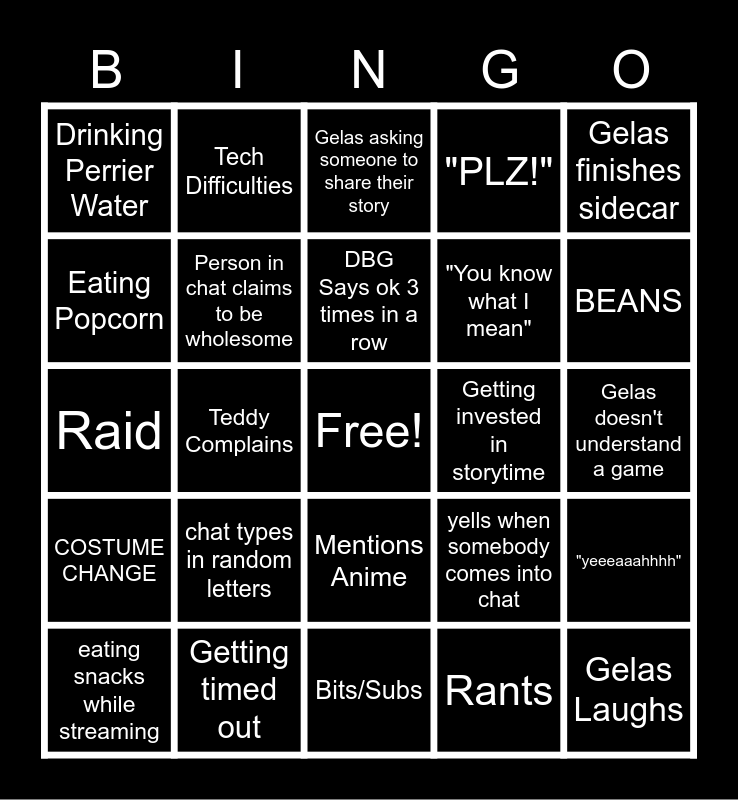 This bingo card has a free space and 24 words: chat types in random letters, Getting timed out, DBG Says ok 3 times in a row, eating snacks while streaming, Gelas finishes sidecar, Drinking Perrier Water, Eating Popcorn, Tech Difficulties, Getting invested in storytime, Mentions Anime, "You know what I mean", Raid, yells when somebody comes into chat, "yeeeaaahhhh", Person in chat claims to be wholesome, Rants, Gelas doesn't understand a game, Gelas asking someone to share their story, BEANS, Teddy Complains, Gelas Laughs, COSTUME CHANGE, "PLZ!" and Bits/Subs.